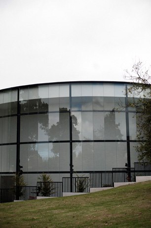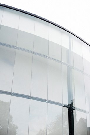 Curved glass curtain wall mounted in stainless steel.