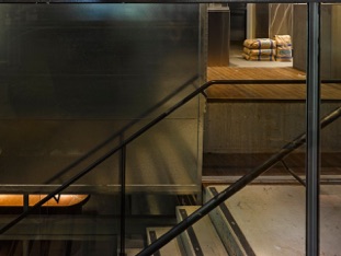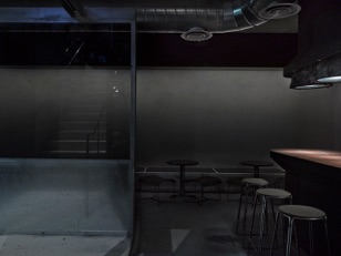 Basement bar showing glass and steel partition and end of bar counter.