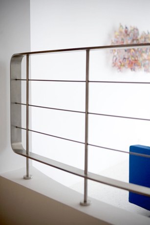 Spiral rolled stainless steel tubular handrail.