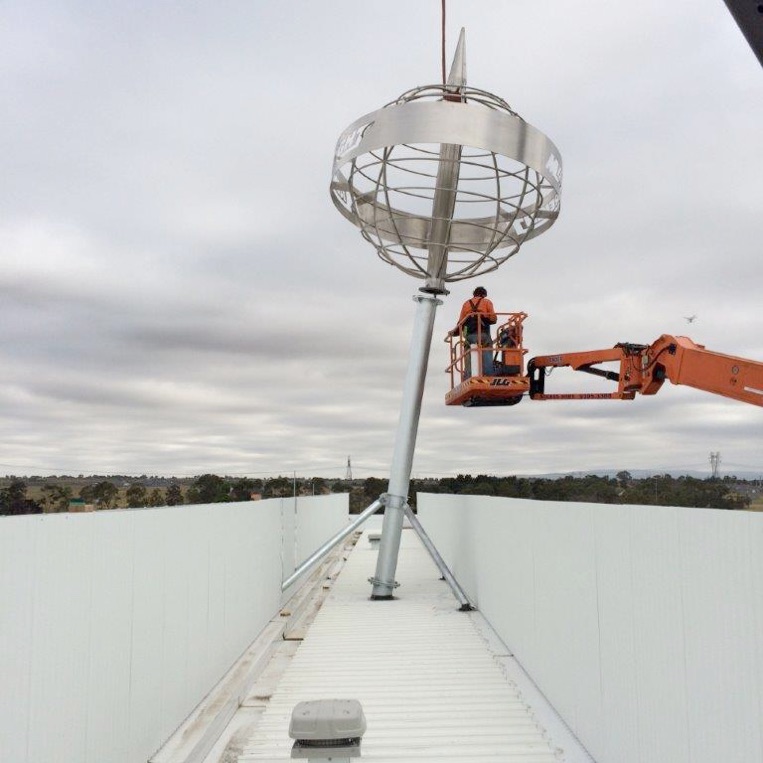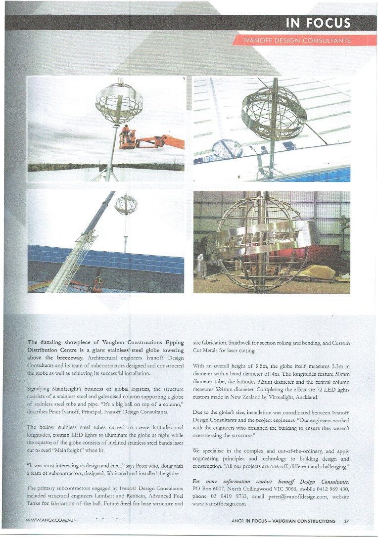 The show piece of Vaughan Constructions Epping Distribution Centre is a giant stainless steel globe towering above the breezeway. Architectural engineers Ivanoff Design Consultants and its team of subcontractors designed and constructed the globe as well as achieving its successful installation.