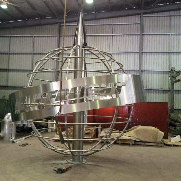 The hollow stainless steel tubes curved to create latitudes and longitudes, contain LED lights to eliminate the globe at night while the equator of the globe consists of inclined stainless steel bands laser cut to read “Mainfreight” when lit.