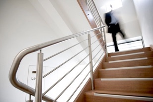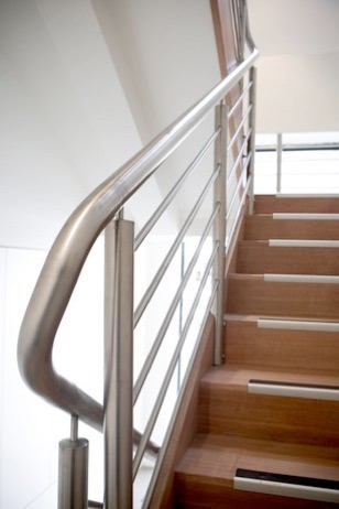 Stainless steel tubular handrail and baluster: timber hardwood enclosed riser treads. Stainless steel handrail continuous over four floors.